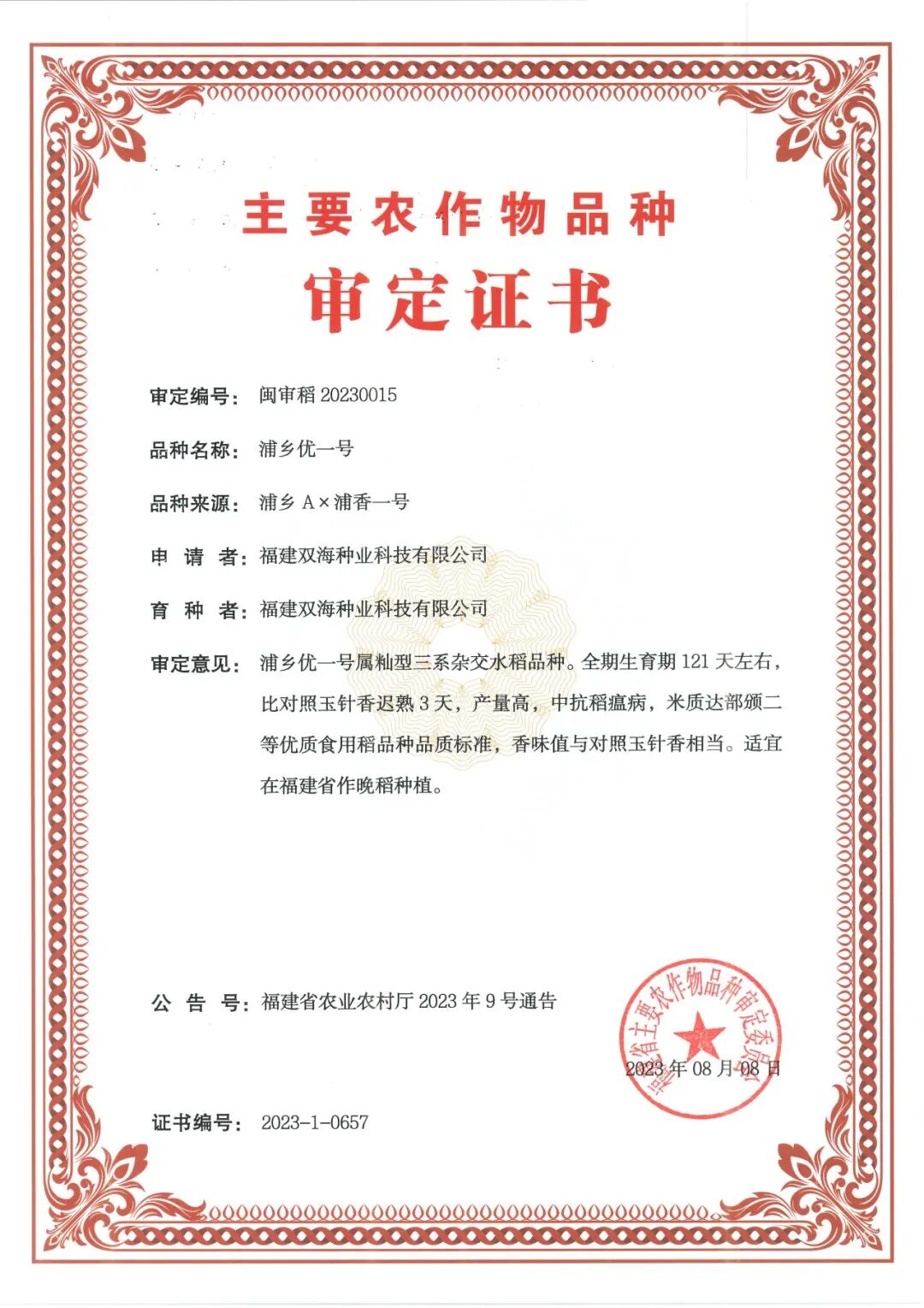 “浦乡优一号”审定证书